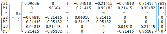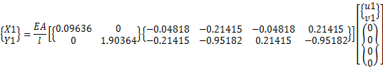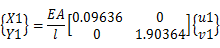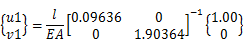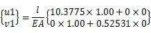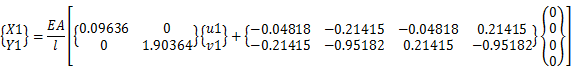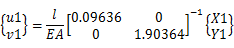 外力として節点1のX方向に1.00を作用させる(Y方向は0)ので、X1=1.00、Y1=0を代入すると